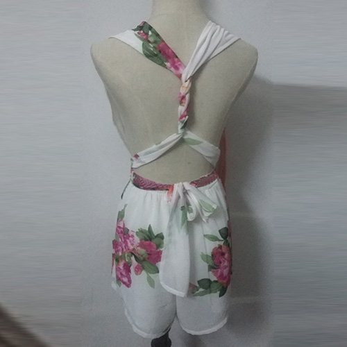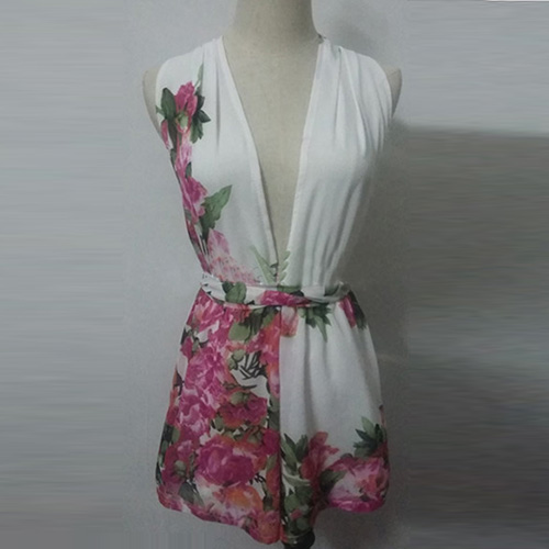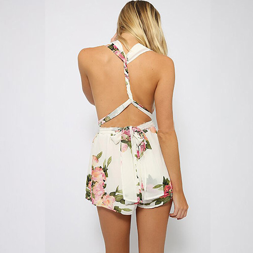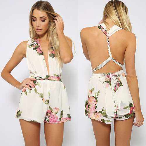 Sexy Backless Deep V-neck Floral Print Chiffon Rompers