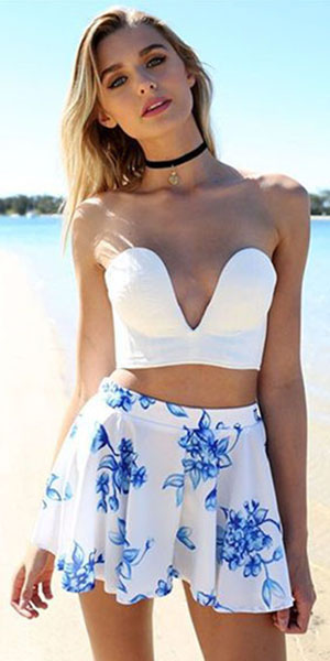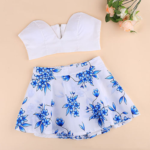 strapless white crop tops and a high waist floral print pleated shorts. Matching them together,looks so