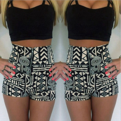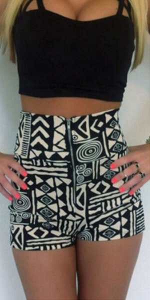 Two-piece style,including a black crop tops and a high waist floral print shorts.