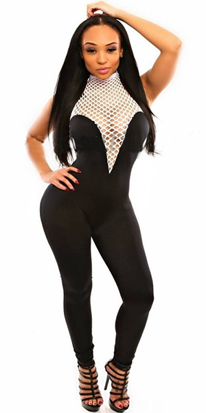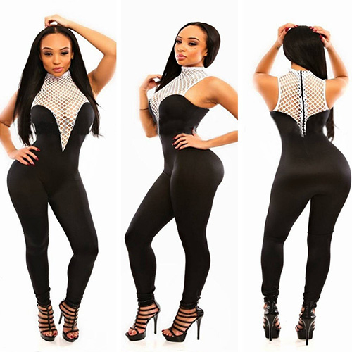 When first time to see this jumpsuit,you can't resist its temptation. Its hollow out reticular spliced