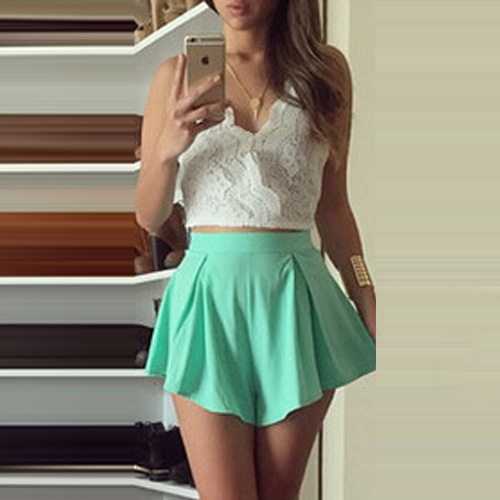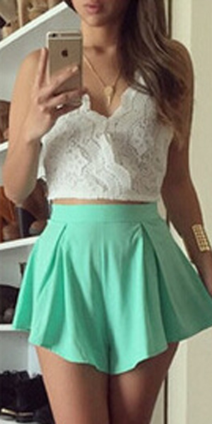 Two-piece style,including a white lace tops and a green shorts. Tops with sleeveless and deep v-neck