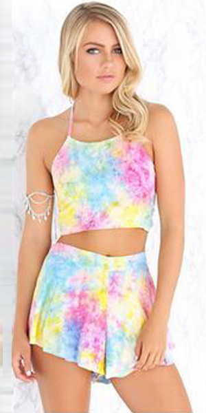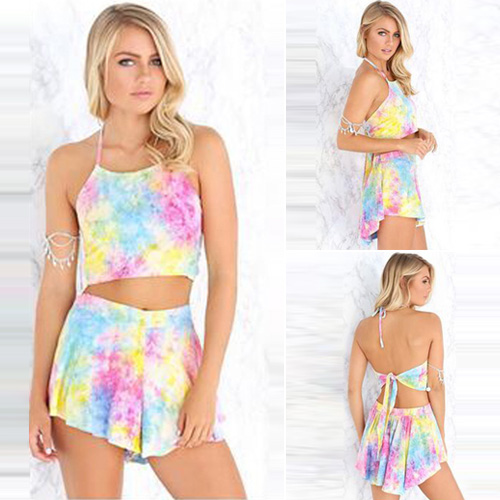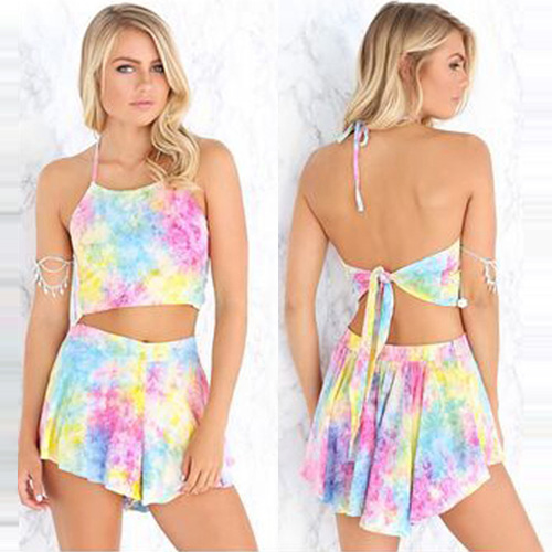 Two-piece style,with a backless tops and a high waist shorts. Tops with backless and