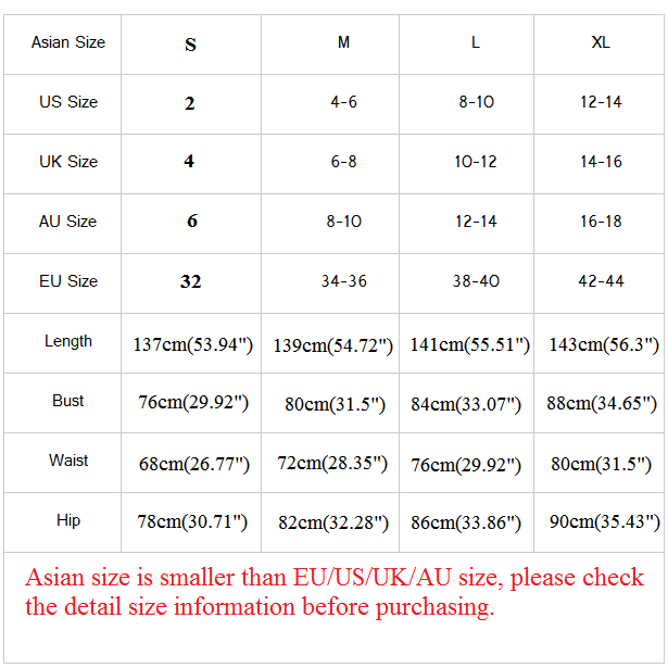 S : Bust : 76cm(29.92"); Waist : 68cm(26.77"); Hips : 78cm(30.71"); Length : 137cm(53.94");