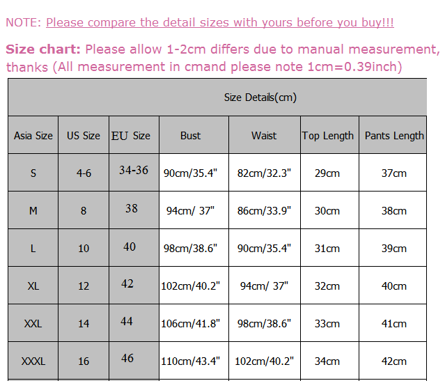 XL : Bust : 104cm(40.94"); Waist : 94cm(37.01"); Top Length : 32cm(12.6"); Pants Length : 38cm(14.96");