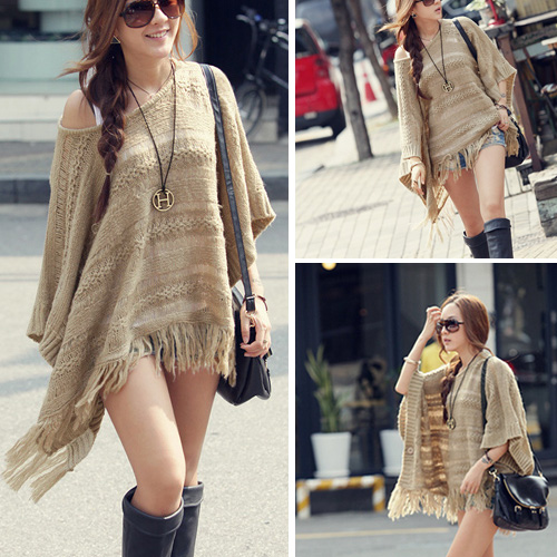 Wearing this knitting cloak,you absolutely will catch their eyes and envy your chic style. Hemline with tassels design,bat sleeve and hollow out design. Take it to start your fashion street shoot.