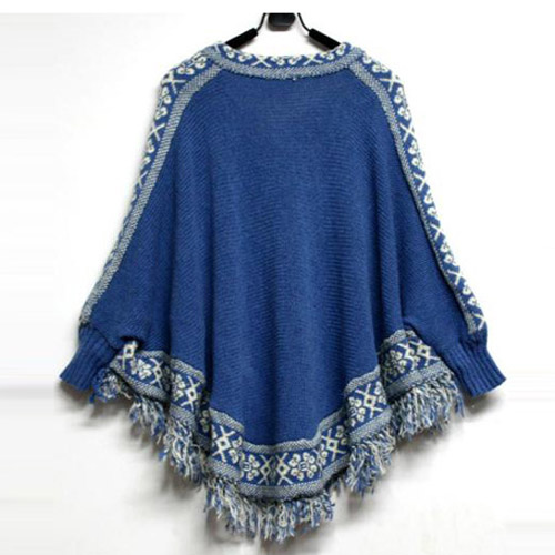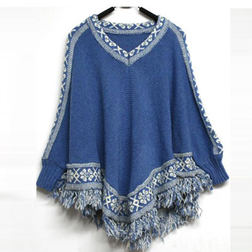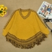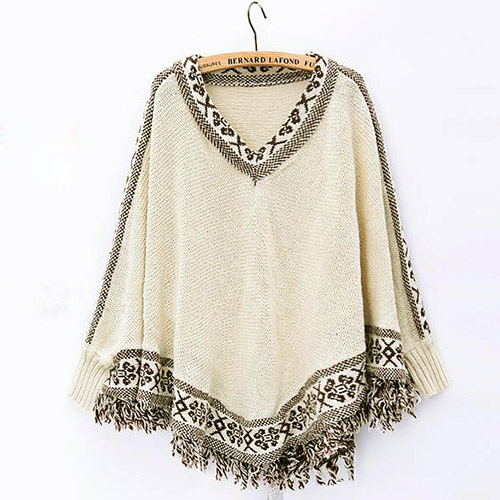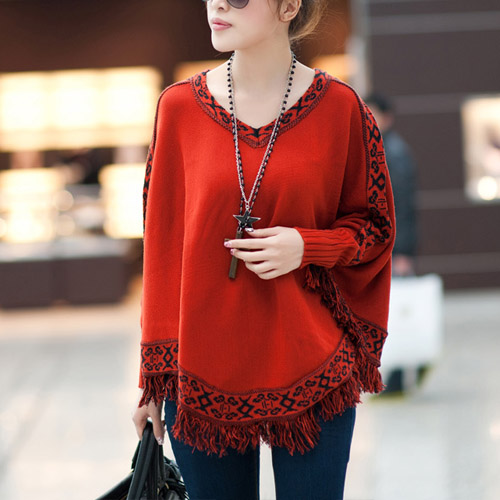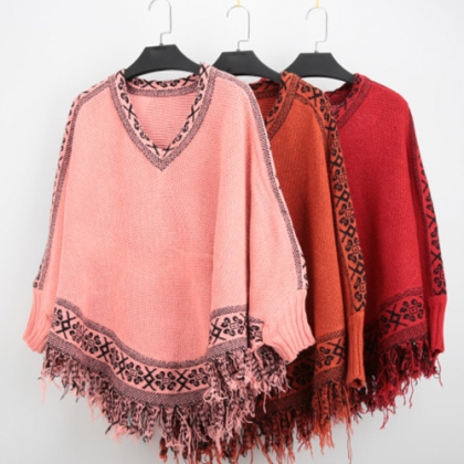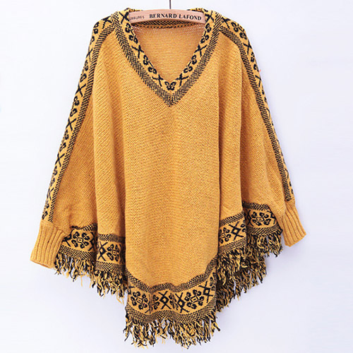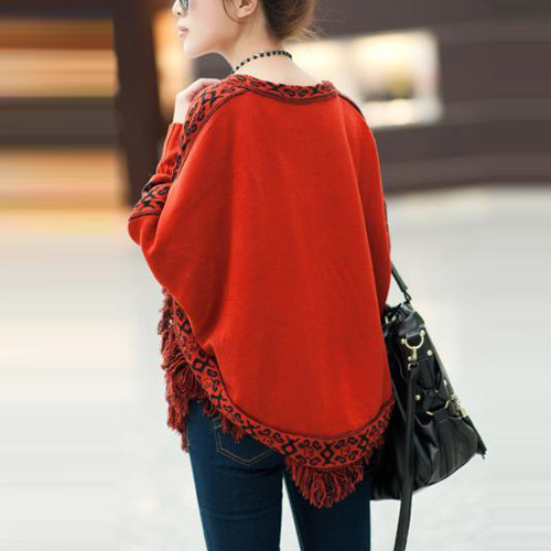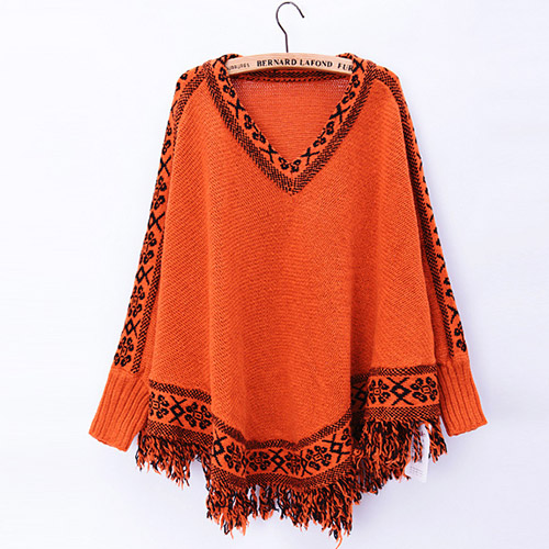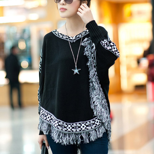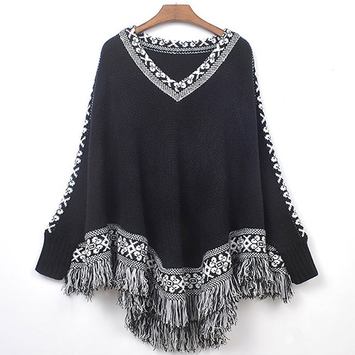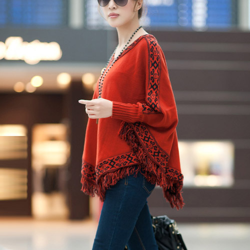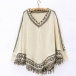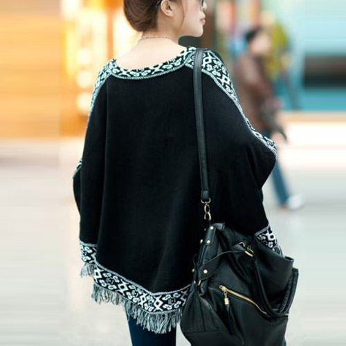 Fashion Bat Sleeve V-neck Tassel Hem Cape-style Knitted Sweater