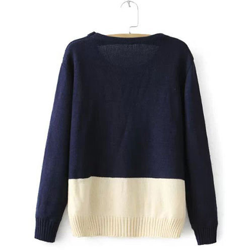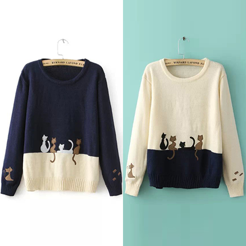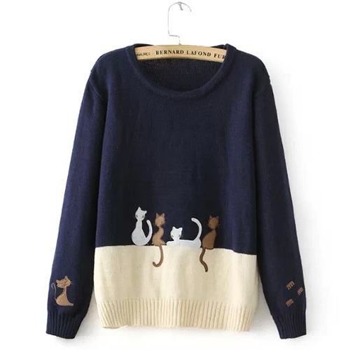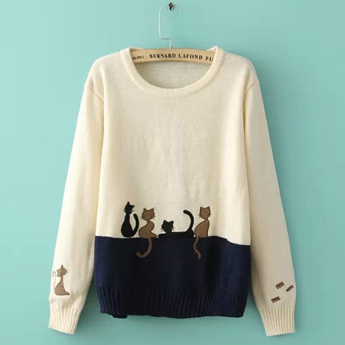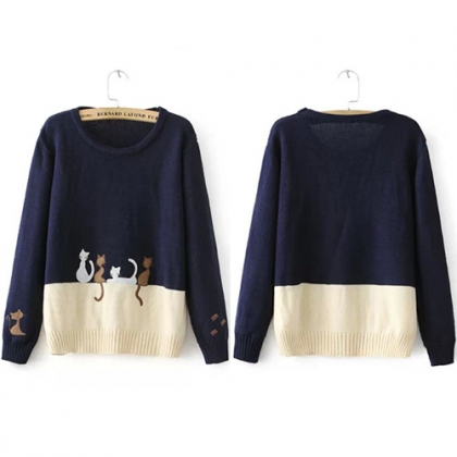 Fashion Contrast Color Cat Embroidered Pullover Sweater