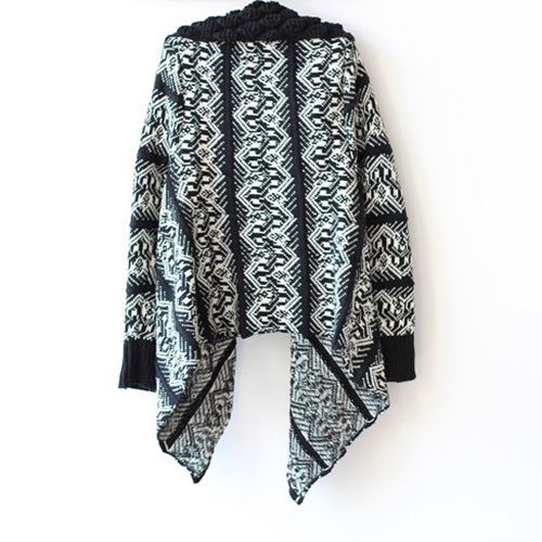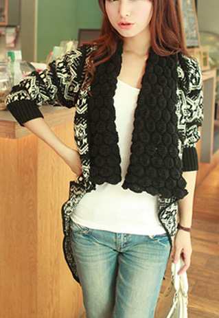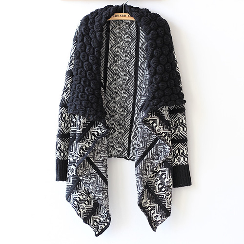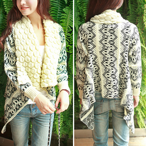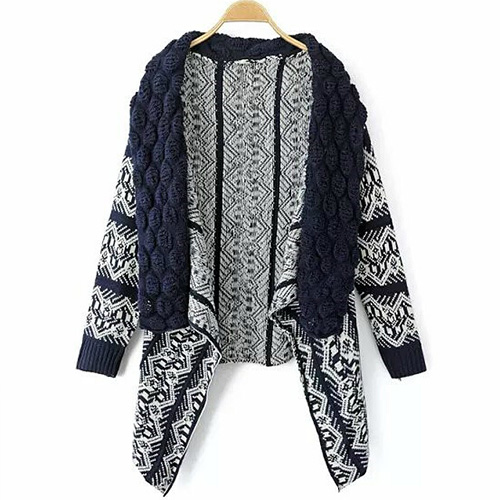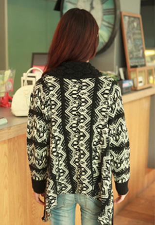 In this cool fall and winter,you need a knitting cardigan accompany you and keep you warm. Look at this cardigan,which features contrast color style,with ethnic customs sense. Irregular hemline and a big lapel make it unique. No matter match with a tank top or tight t-shirt,it is perfect.