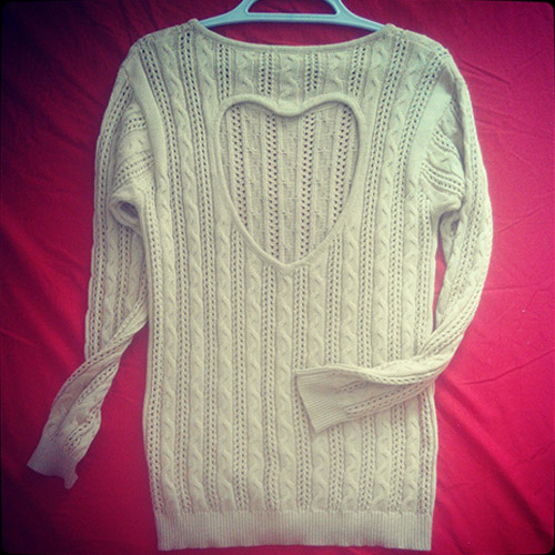 This sweater features solid color style. Backside with heart-shaped hollow out backless design.