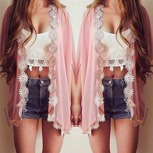 Fashion Lace Spliced Bat Sleeve Sunscreen Chiffon Cardigan