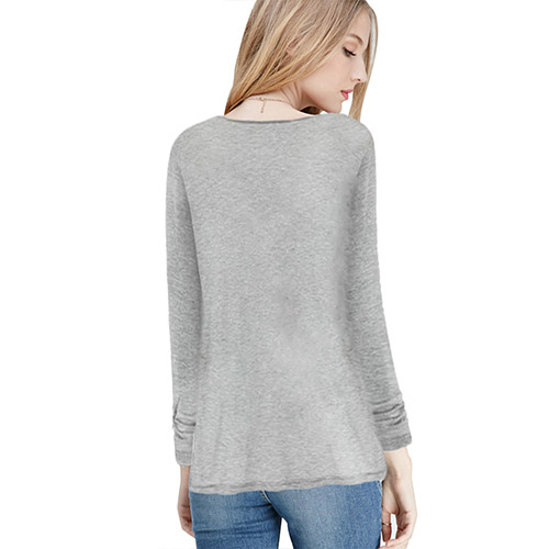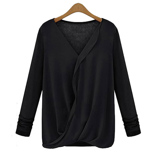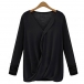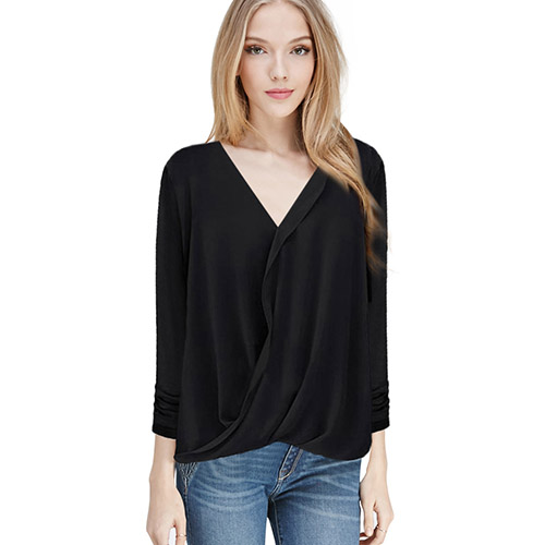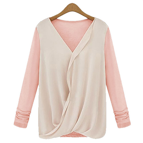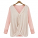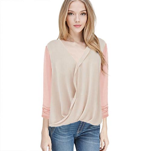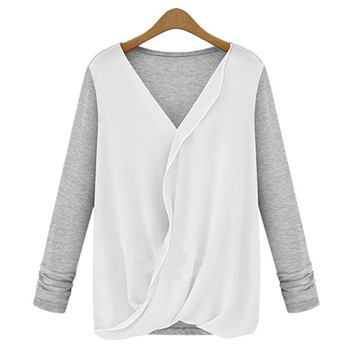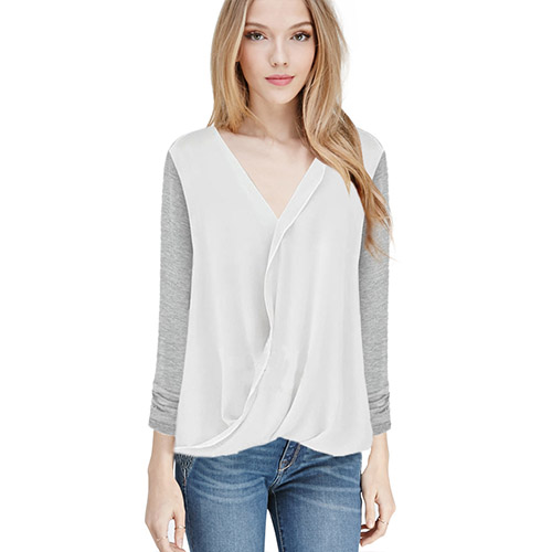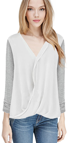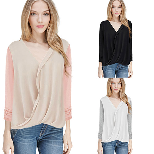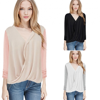 This shirt features contrast color style,with long sleeve and crossover v-neck design,