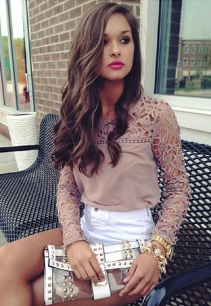 Show your elegant temperament and charming flavor with this shirt. It features hollow out crochet lace spliced design,sexy and charming. Long sleeve and round neck style. No matter pair with shorts,jeans or skirt,it looks perfect.