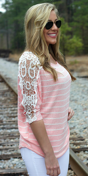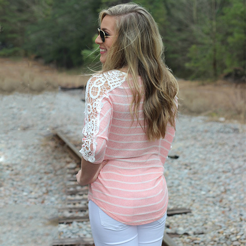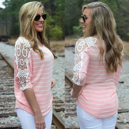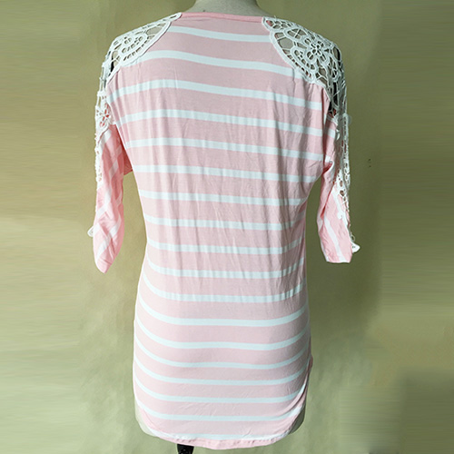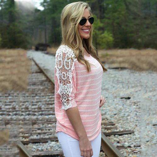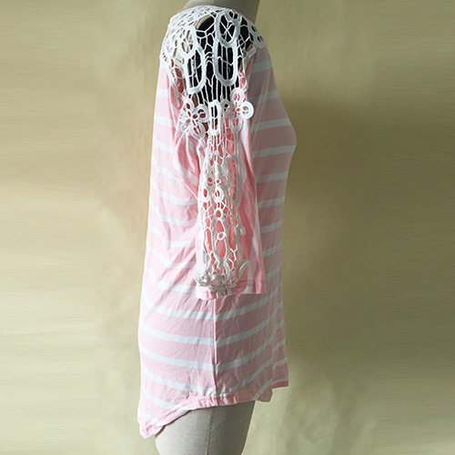 Achieve a chic look in one simple step with this t-shirt. Striped style,its hollow out lace crochet