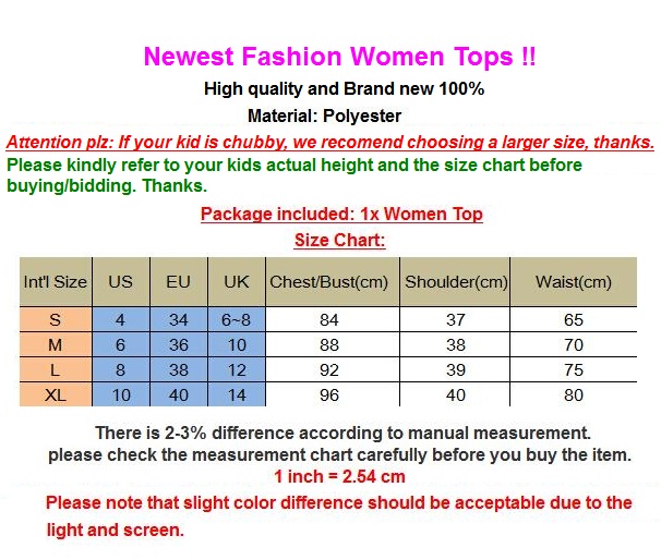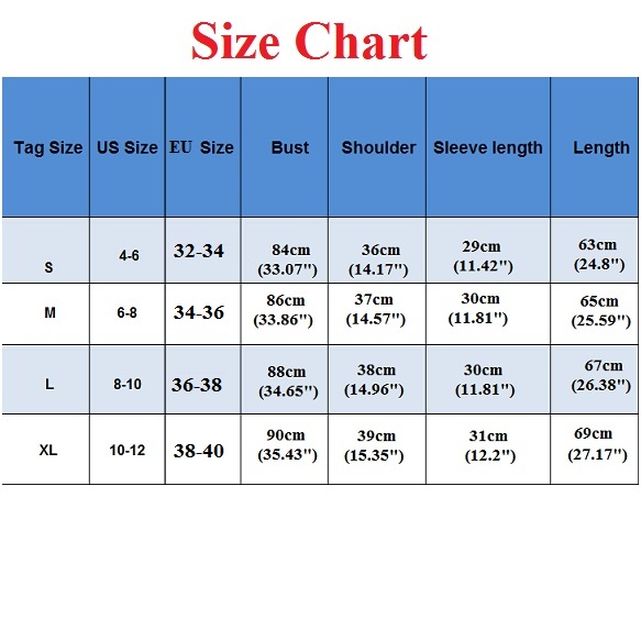 XL : Bust : 90cm(35.43"); Shoulder : 39cm(15.35"); Sleeve : 31cm(12.2");