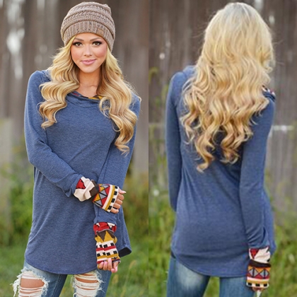 Fashion Printed Spliced Long Sleeve Hooded T-shirt