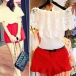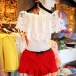 This suit consists of two pieces:tops and shorts. Tops featuring slash neck off-shoulder style,with lace crochet flouncing and gather waistline design. Shorts with red colorway. Perfect and elegant for matching them together.