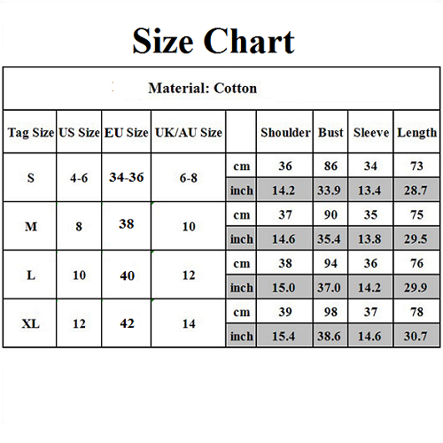 XL : Bust : 98cm(38.58"); Waist : 89cm(35.04"); Sleeve : 37cm(14.57"); Length : 78cm(30.71");