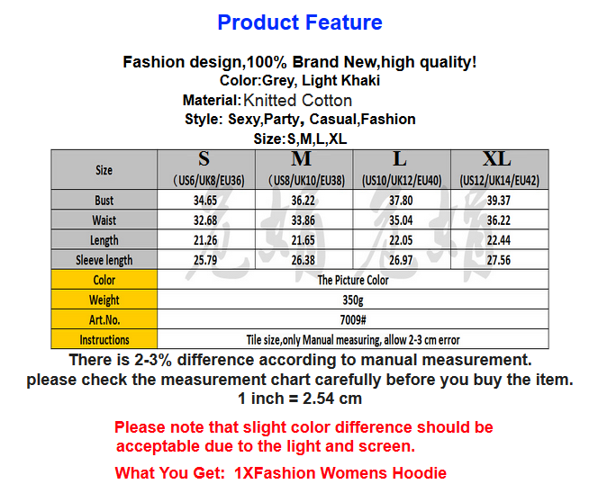 XL : Bust : 100cm(39.37"); Waist : 92cm(36.22"); Sleeve : 70cm(27.56"); Length : 57cm(22.44");