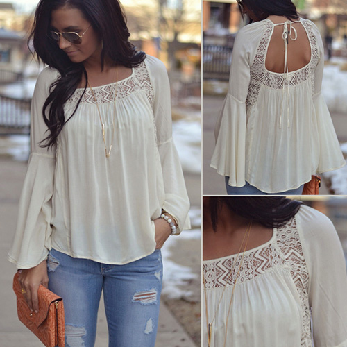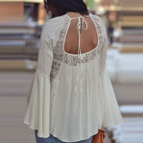 Sexy Backless Lace Spliced Long Sleeve Chiffon Tops