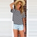 It features striped style,with short sleeve,round neck and crossover
