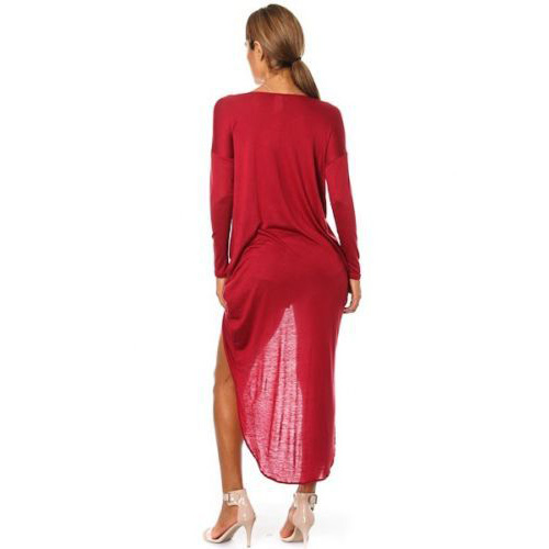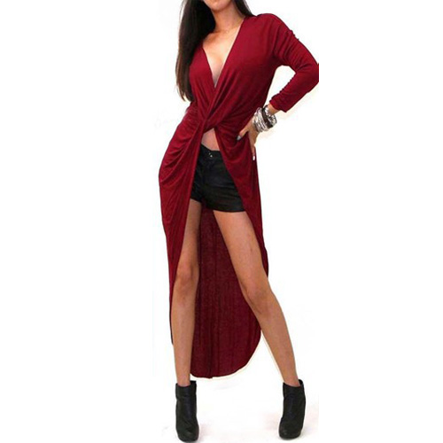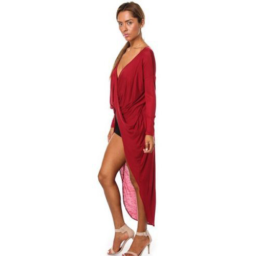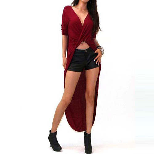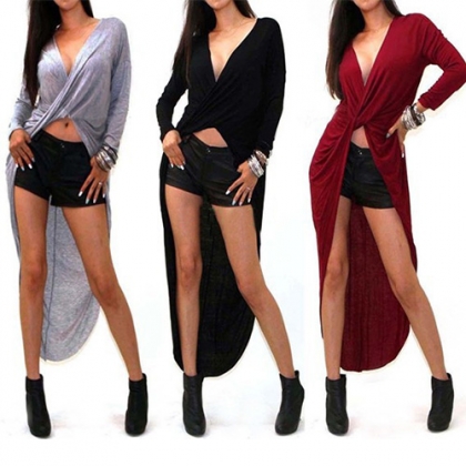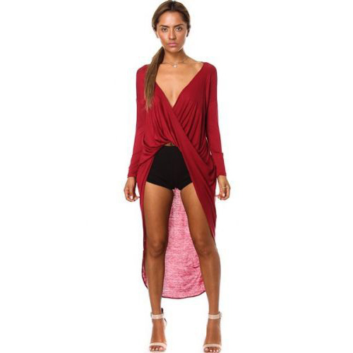 Solid color style,its crossover deep v-neckline and irregular hem design adds