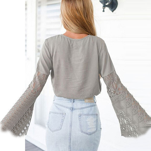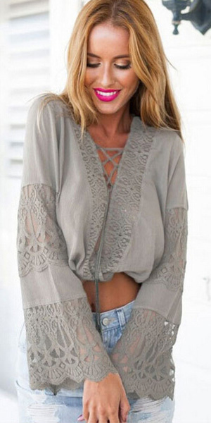 Outfitted with pretty details,such as lace-up v-neck,lace spliced and trumpet-sleeve,
