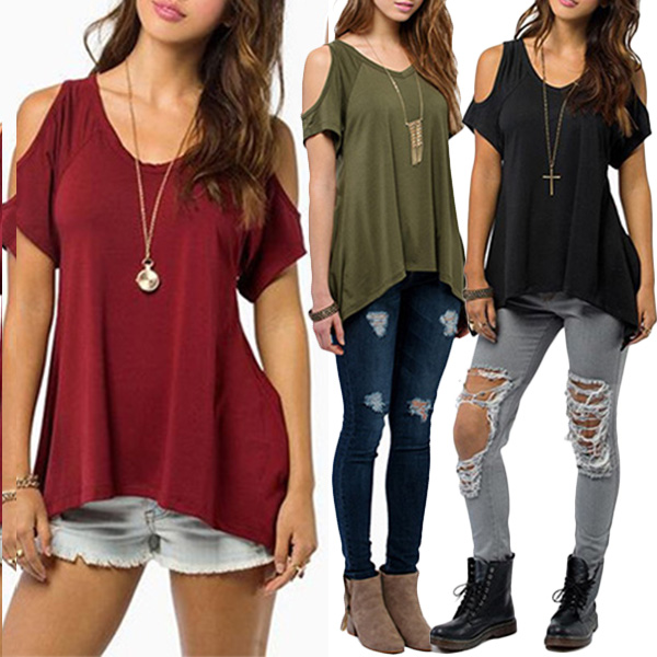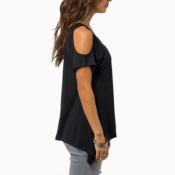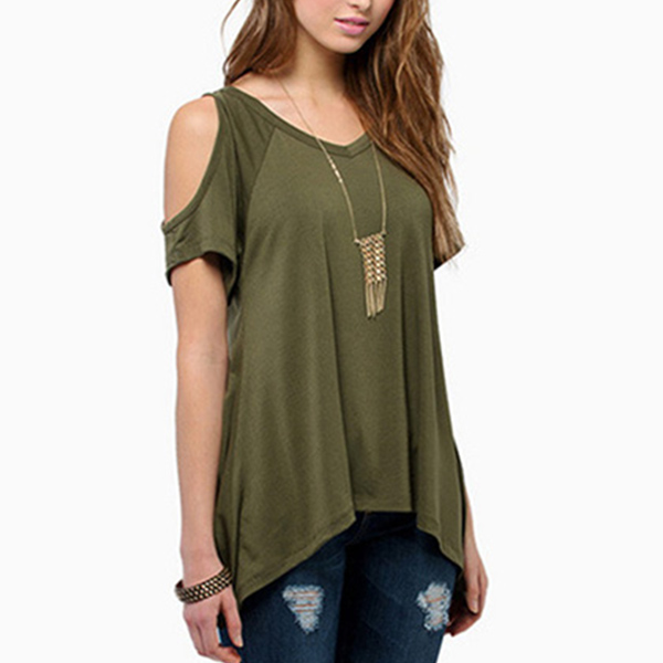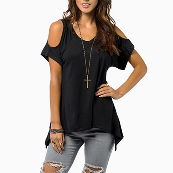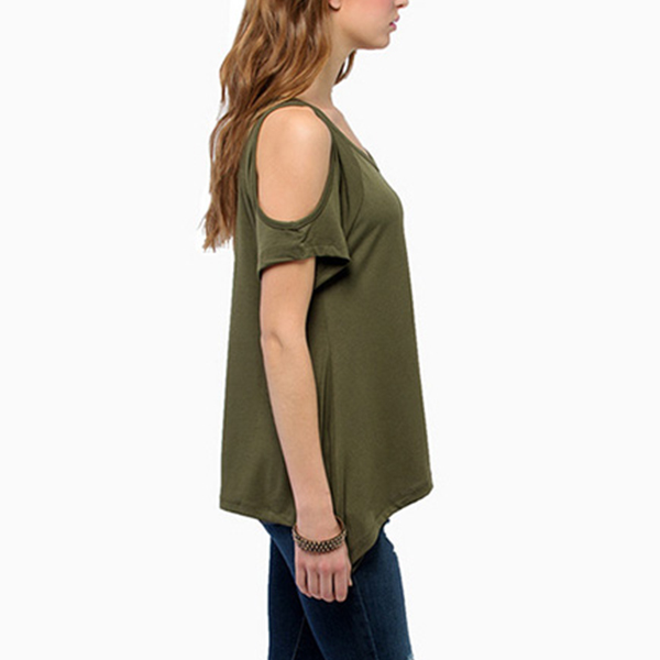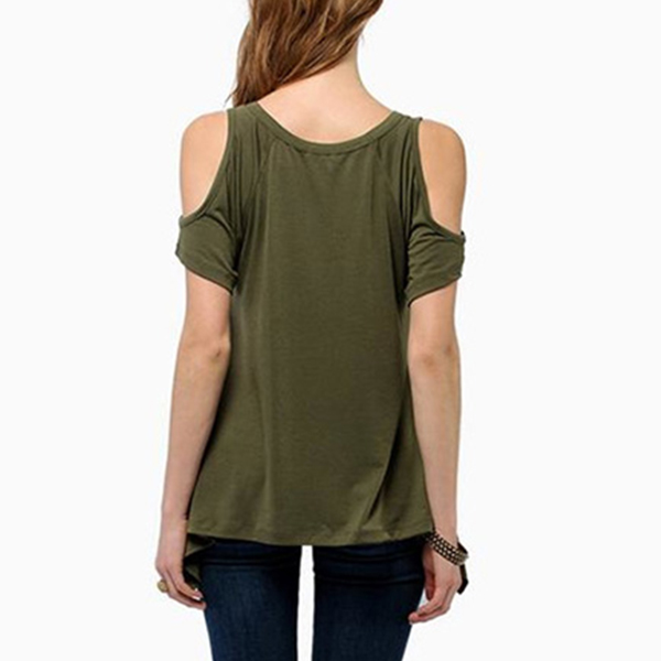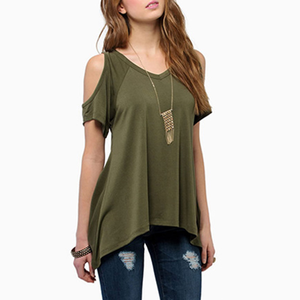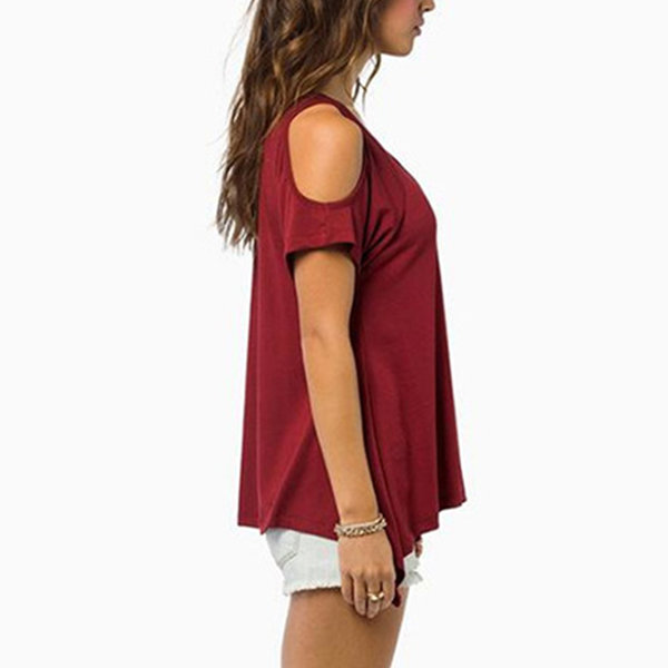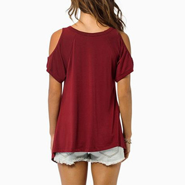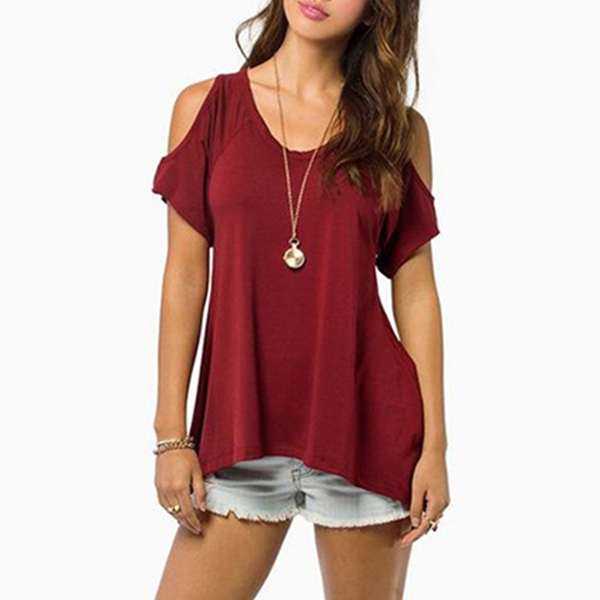 Slip into this short sleeve t-shirt,and you will get a stylish look. Solid color style,with off-shoulder,