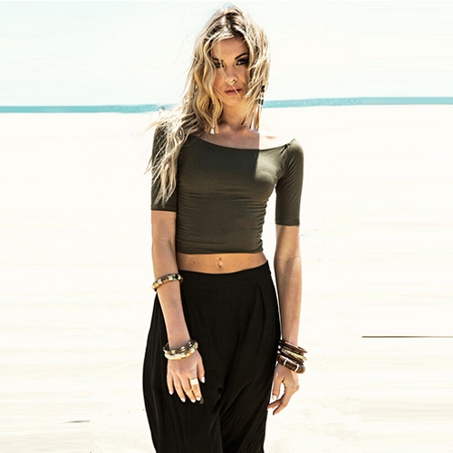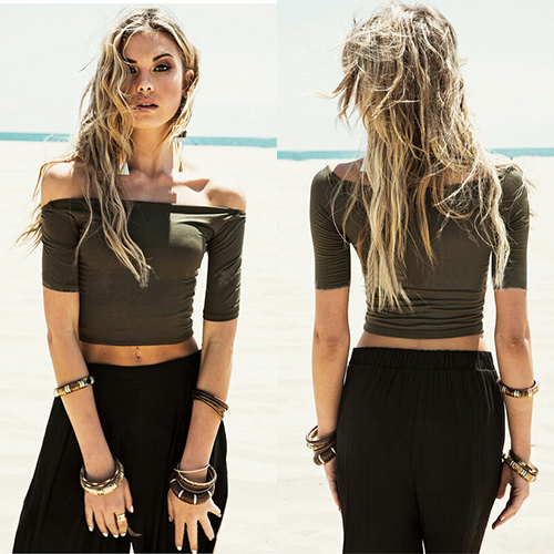 Sexy Slash Neck Short Sleeve Solid Color Crop Tops