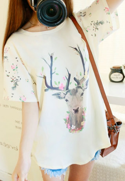 Sweet Deer Floral Print Short Sleeve T Shirt Crew Neck Tops