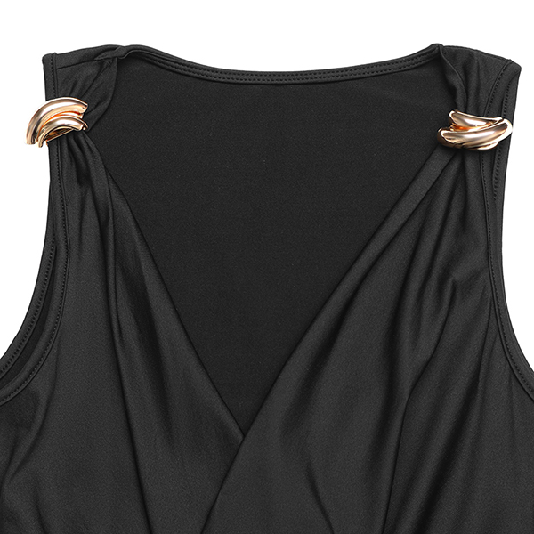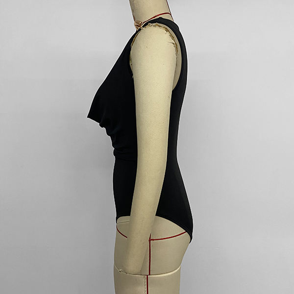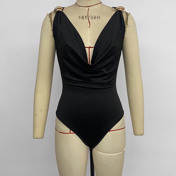 Chic Black Cowl Neck Bodysuit with Gold Metal Ring Straps