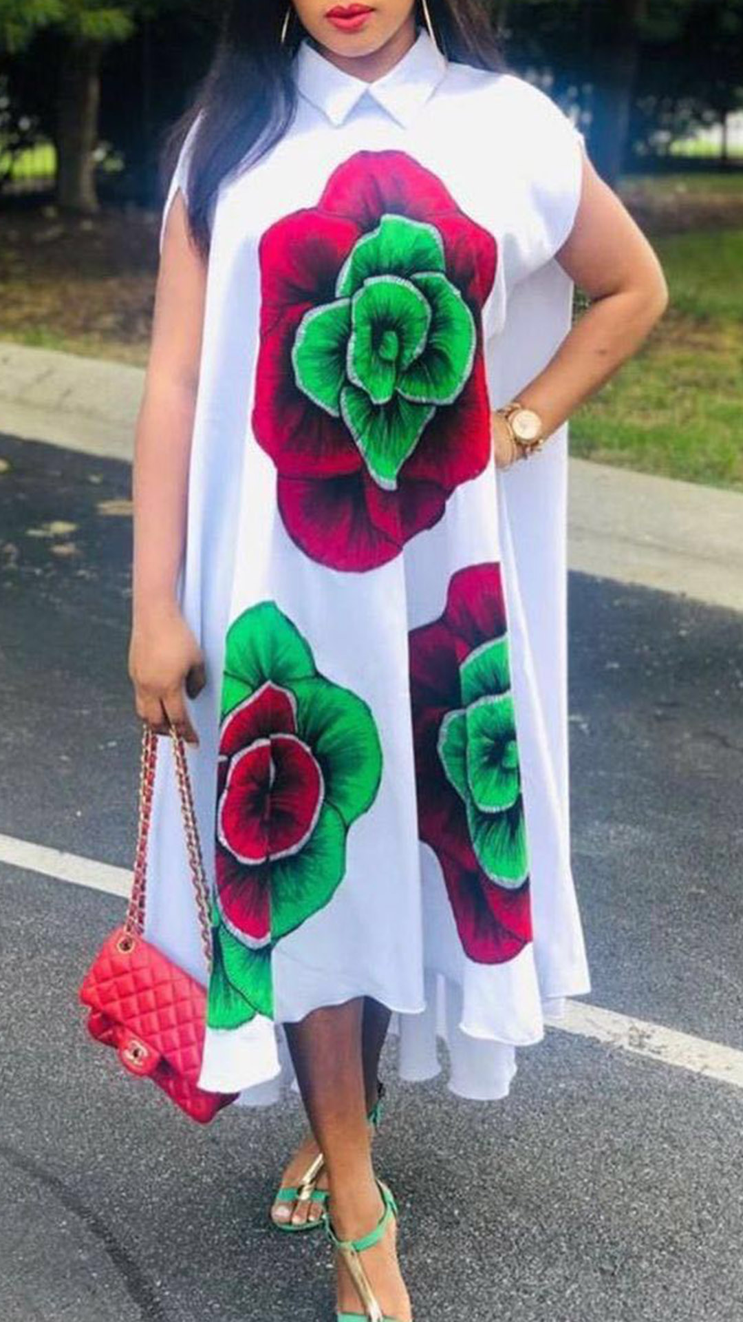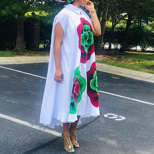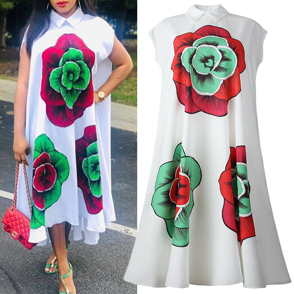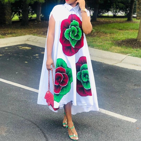 Look chic and stylish in this shirt dress. It features a polo neck, cap sleeves, and a relaxed fit. The big floral print makes this dress perfect for summer days. Pair it with sandals and a straw hat for a casual-chic look.