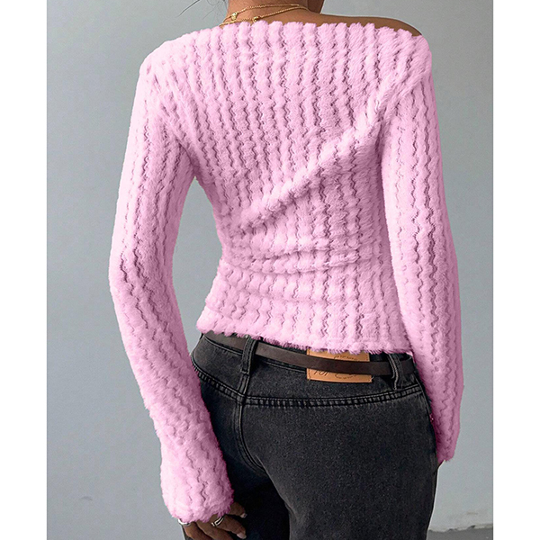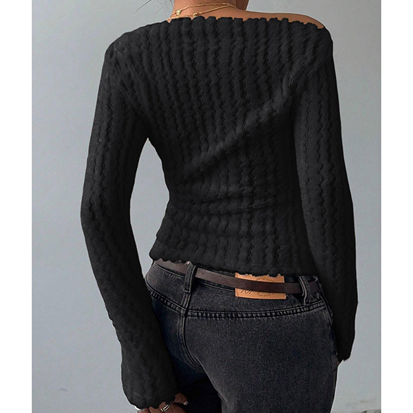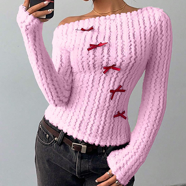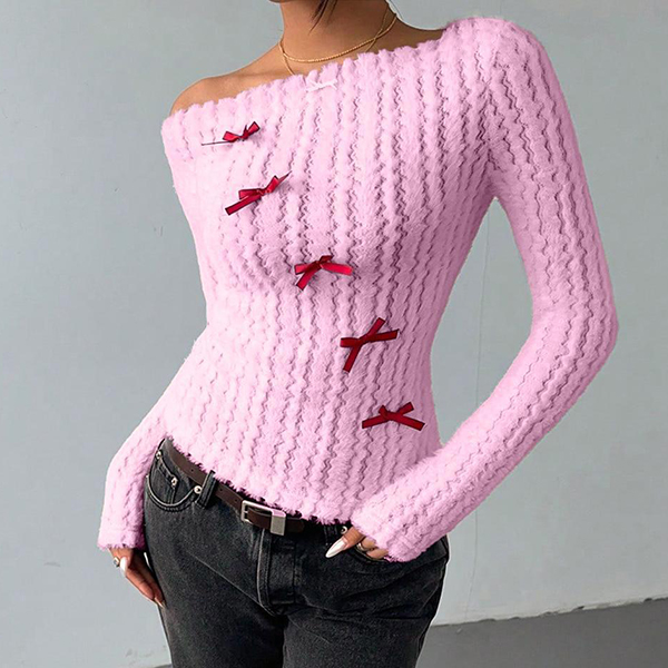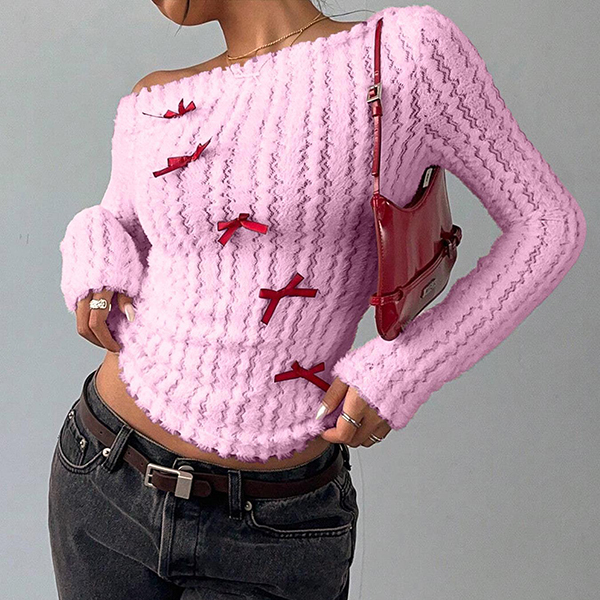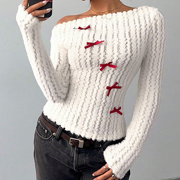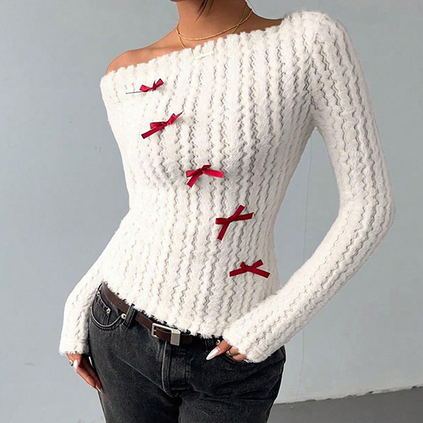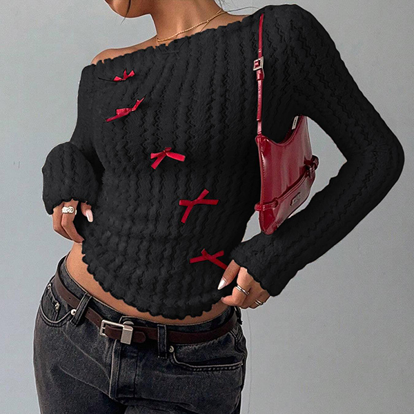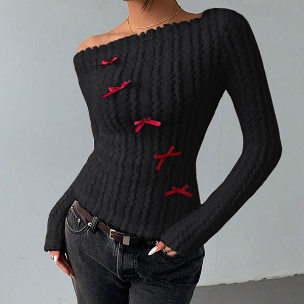 This sophisticated sweater features striking slant shoulder styling with vibrant red coloring and charming bowknot detailing for contemporary chic elegance. Wanna have a try?