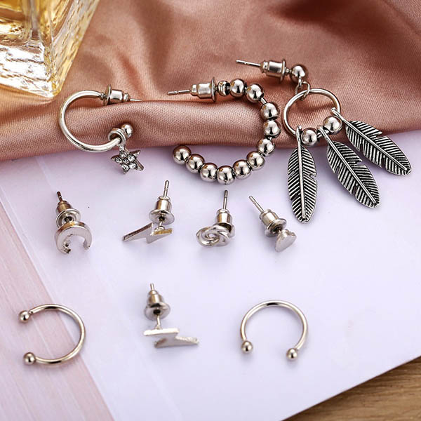 This stud earring set consists of 10 pieces different shape stud earrings like feather shape,lightning shape,crescent shape and so on,which can enrich your overall dress up and boost your entire charm.
