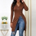 Chic Style High Slit Hem Zipper V-neck Long Sleeve Solid Color T-shirt