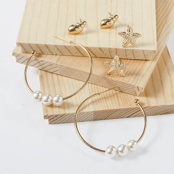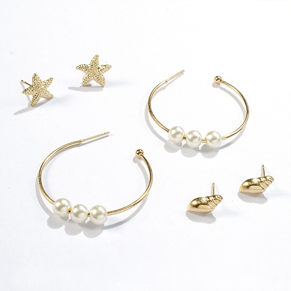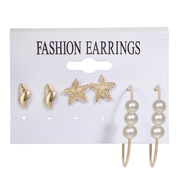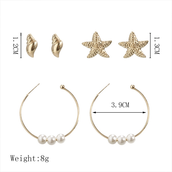 Consists of three pieces different stud earrings,the pearls details and starfish,conch shaped