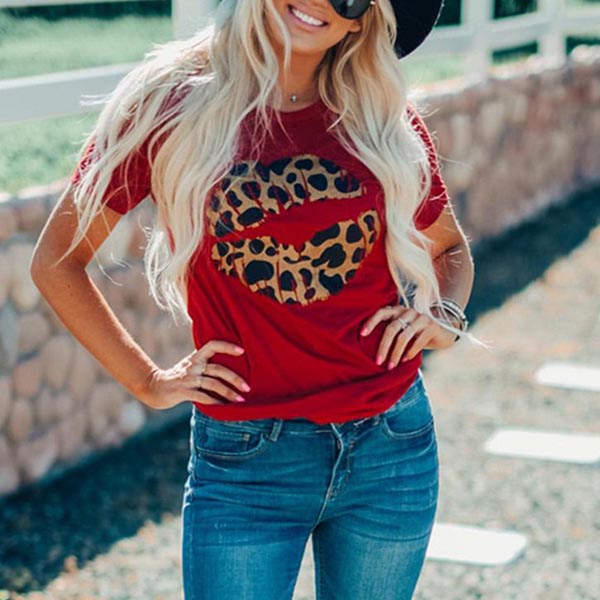 Chic Style Leopard Lip Pattern Short Sleeve Round Neck T-shirt