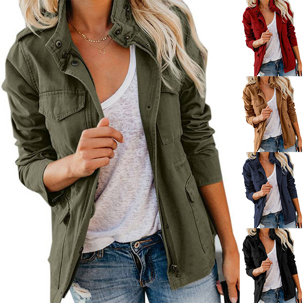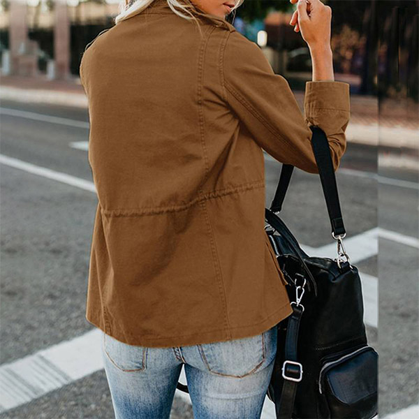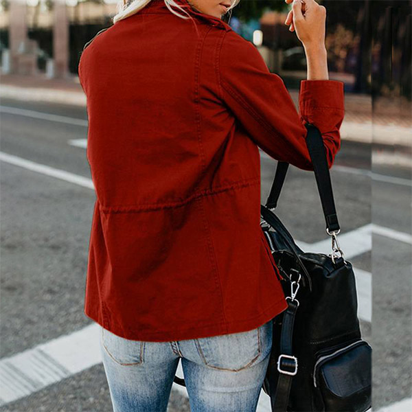 In these early autumn days,this thin blouse can be your perfect choice. Crafted in a solid color,with long sleeve,POLO collar and multi-pockets design,simple yet stylish. And the drawstring waist design at the waist part can help showcase your waistline. Perfect fit for matching with the combo of shorts and crop tops.