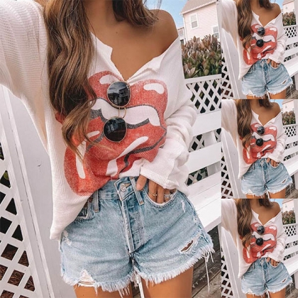 Chic Style Long Sleeve V-neck Lip Printed T-shirt
