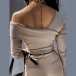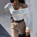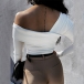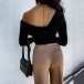 Chic Style Off-shoulder Oblique V-neck Long Sleeve Solid Color Slim Fit T-shirt