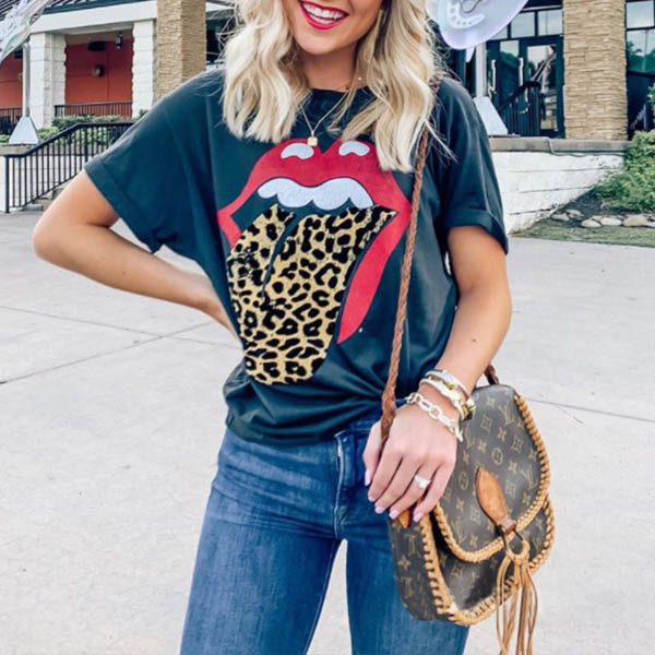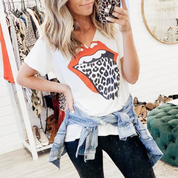 Chic Style Red-lip Printed Short Sleeve Round Neck T-shirt