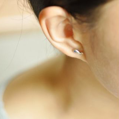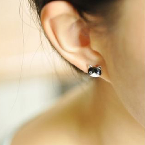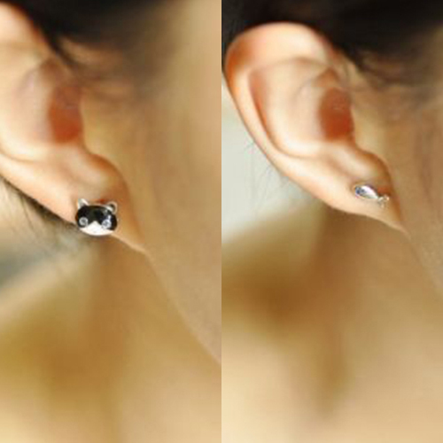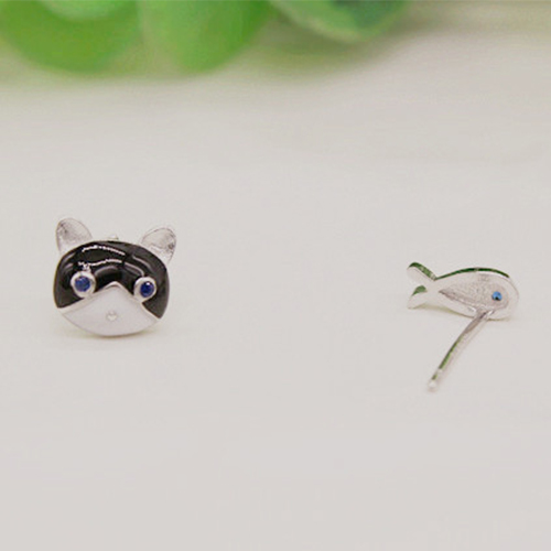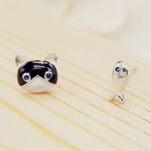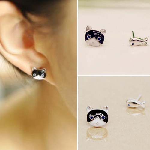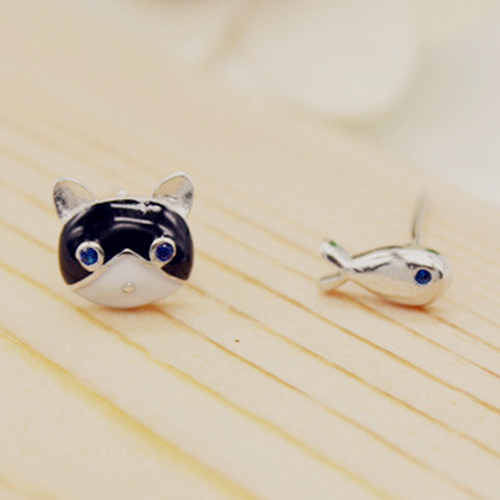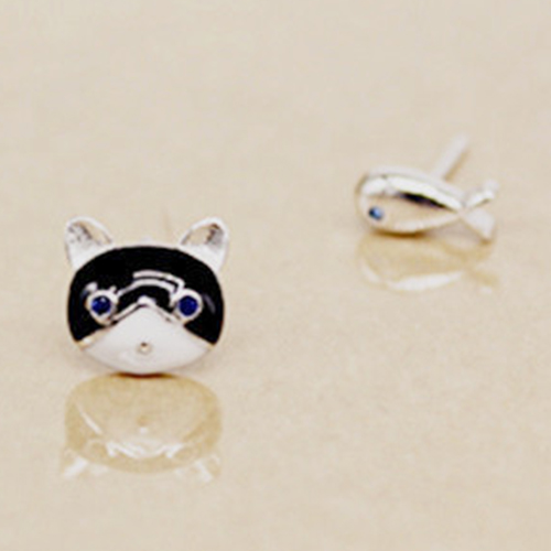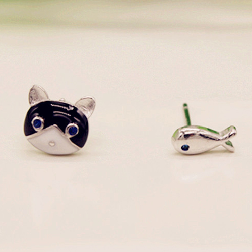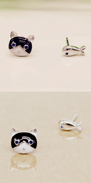 This pair of studs is consisted of a kitty-shaped stud and a fish-shaped stud, which makes
