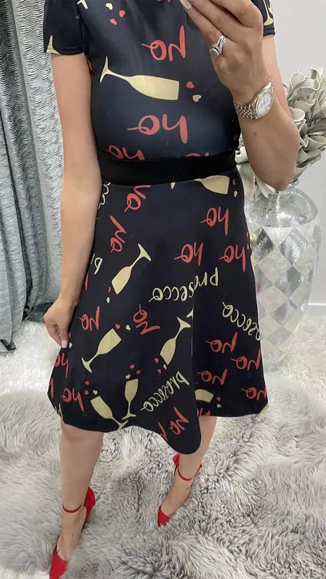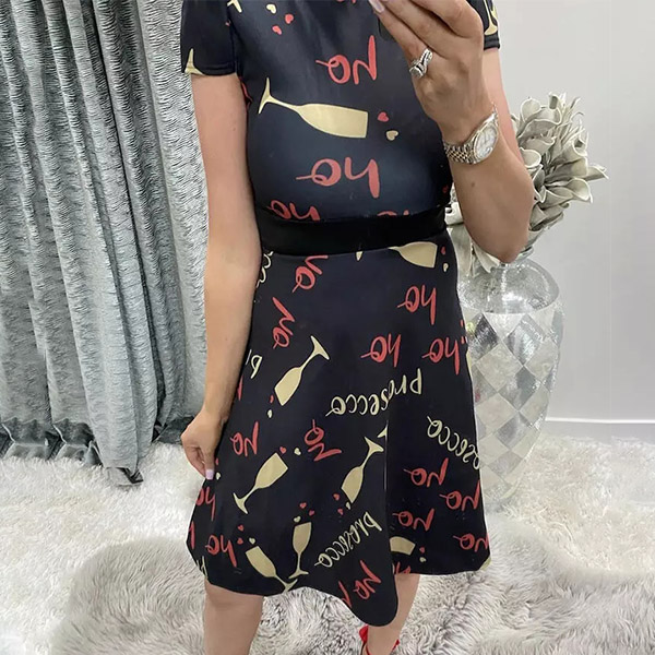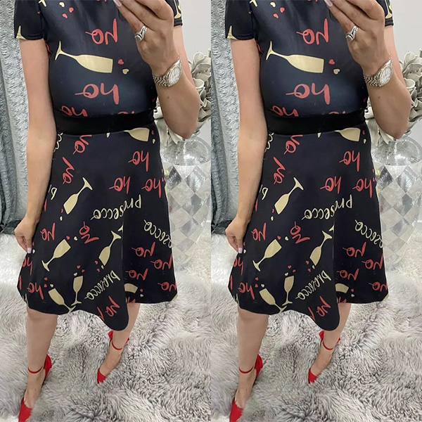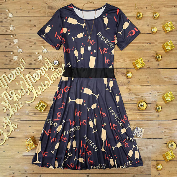 Chic Style Short Sleeve Round Neck High Waist Letters Wine Glass Printed Dress