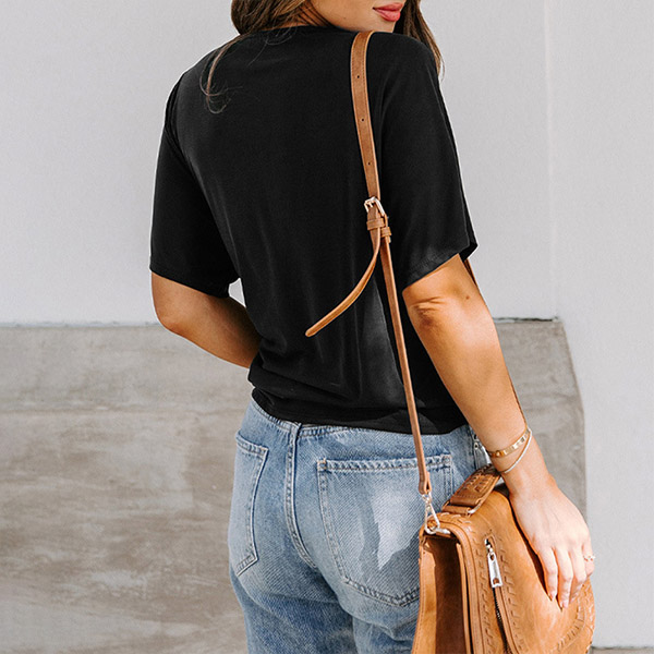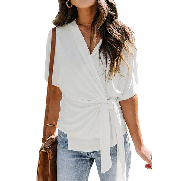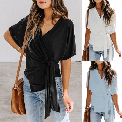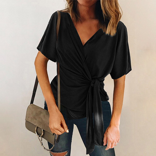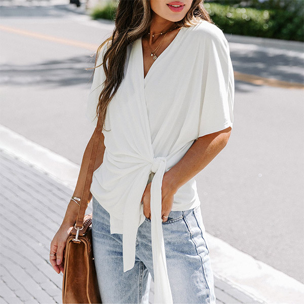 It is a good chance to update your daily style with the help of this chic top. It comes with a solid color,the irregular hem and lace-up design at the waist part make this piece look so distinctive. Finished with short sleeve,v-neck and soft fabric,this piece also can keep the comfy while it exudes your style.