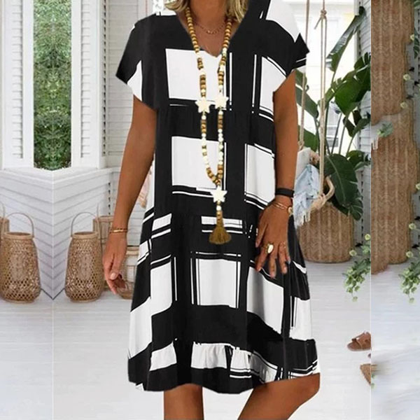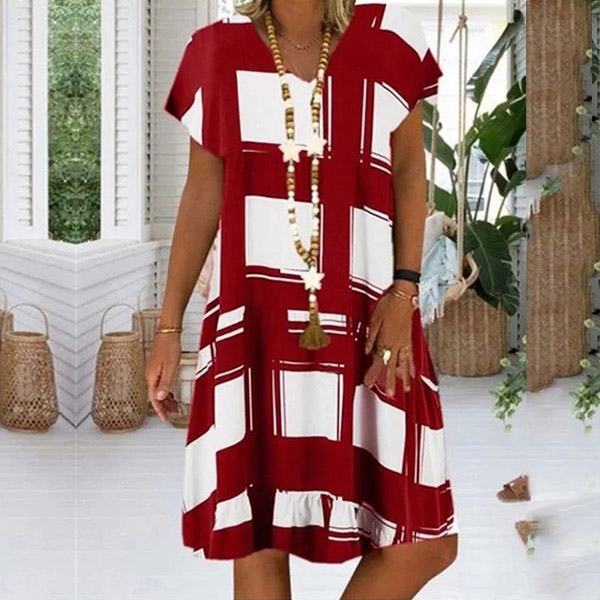 On your lazy days and casual weekends,you can trust in this dress to have a cozy yet stylish style. The plaid element design makes it look more stylish and eye-catching. Finished with short sleeve,v-neck and a loose silhouette,this dress can give you a long-lasting comfort with its soft and breathable fabric.