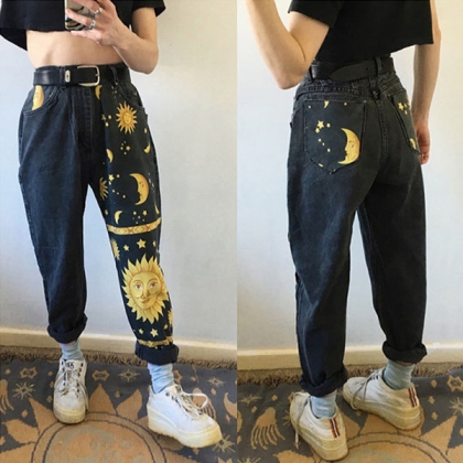 Chic Style Sun Crescent Printed Relaxed-fit Jeans