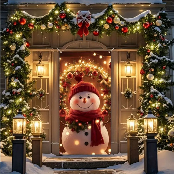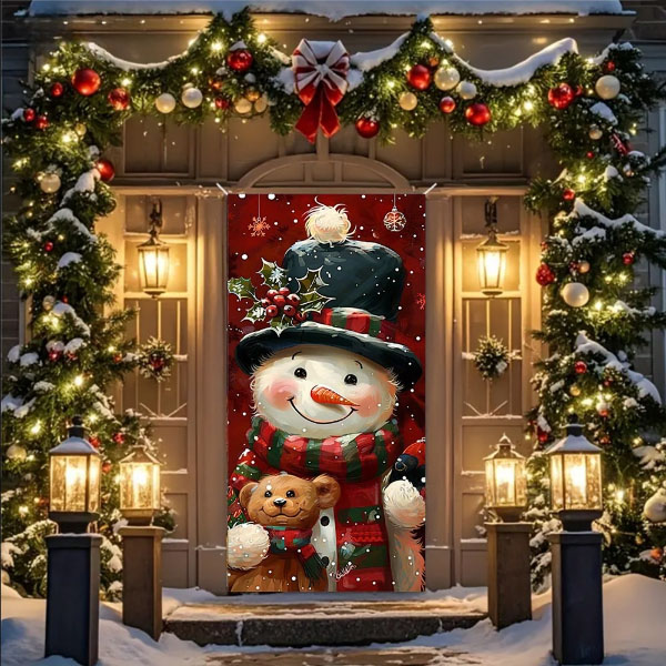 Christmas Door Banner Decorations, Santa Claus Snowman Door Cover for Front Door, Indoor Outdoor Holiday Party Porch Wall Decor, Reusable Polyester Fabric Xmas Photo Booth Backdrop