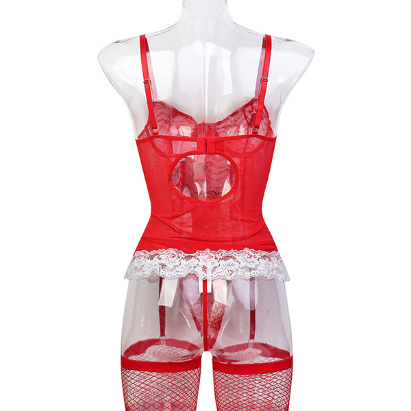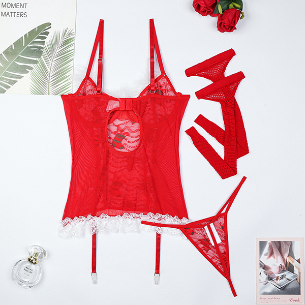 Christmas Lingerie Set with Lace Cross Straps and Feather Suspenders Three-Piece