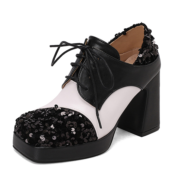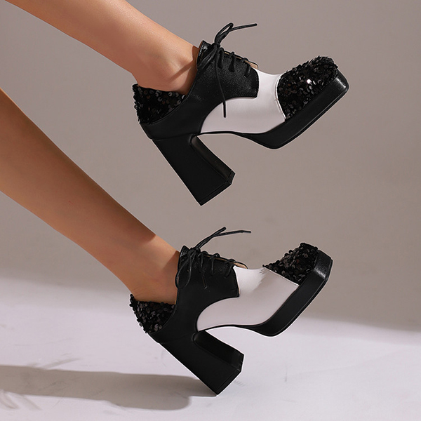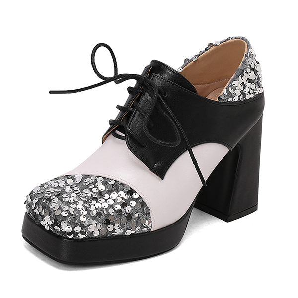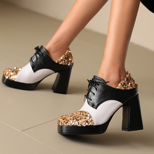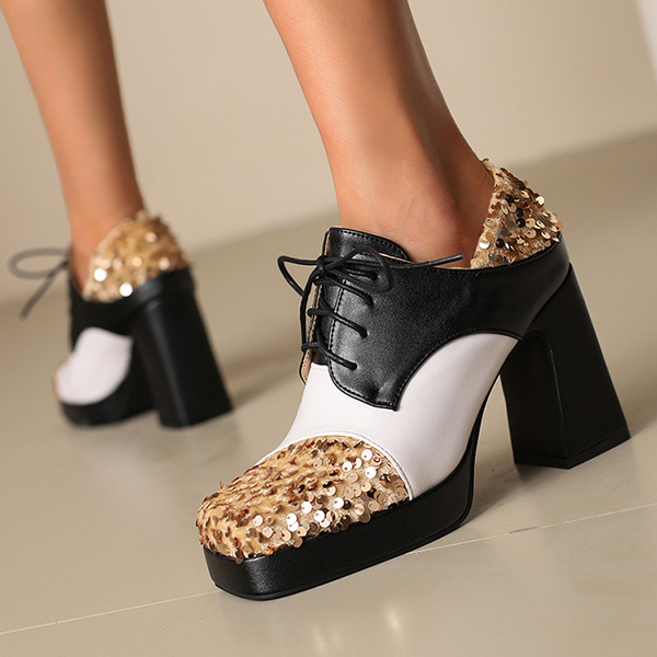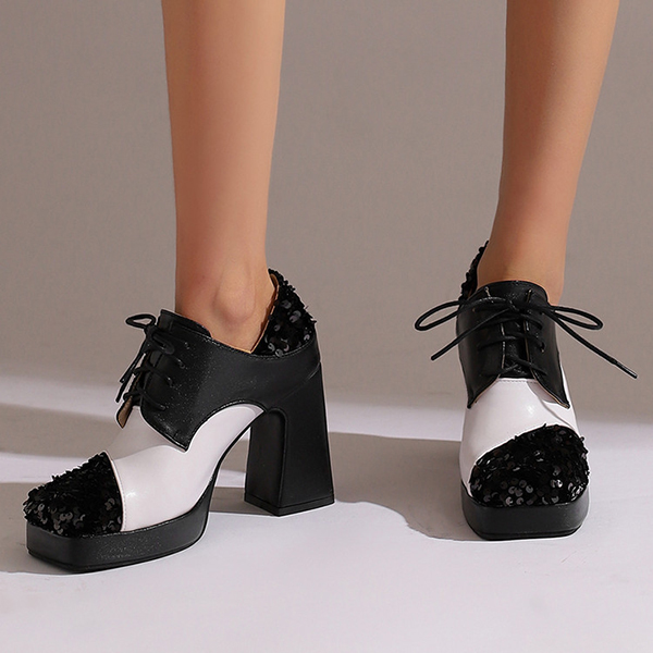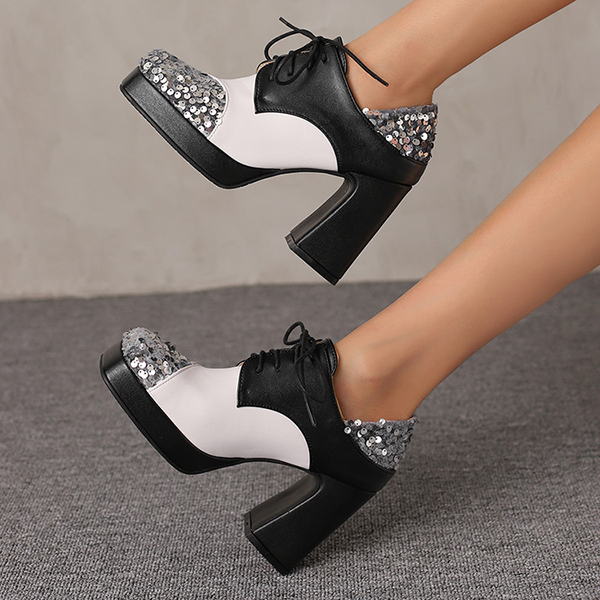 Chunky Heel Sequin Lace-up Shoes with Thick Soles