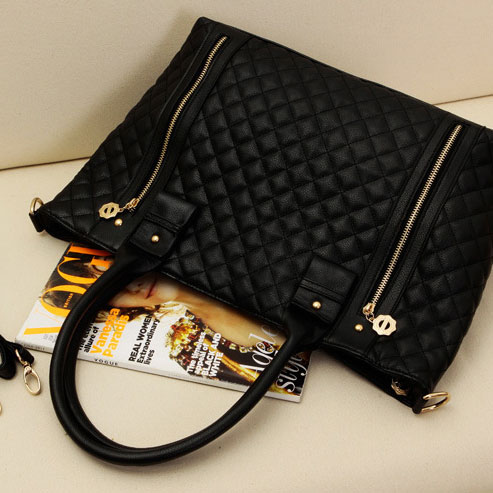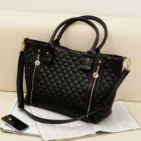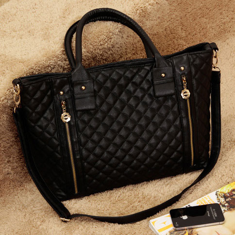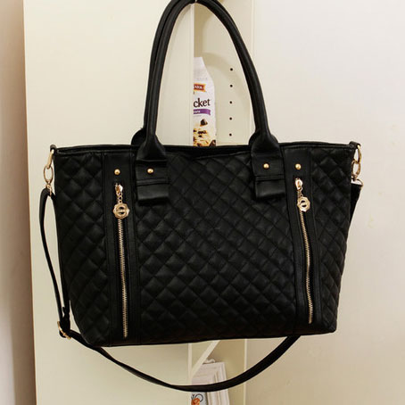 Classy Black Diamond Check Quilted Veritical Zipper Purse Tote Shoulder Hand