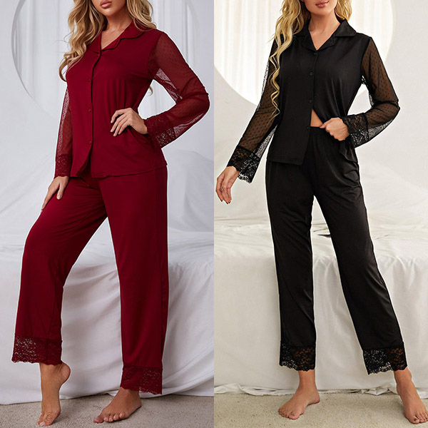 This two-piece loungewear set consists of a long sleeve shirt and ankle-length pants. Airy material, semi-through gauze spliced long sleeve, and lace spliced pant cuff make add some sexy vibe.